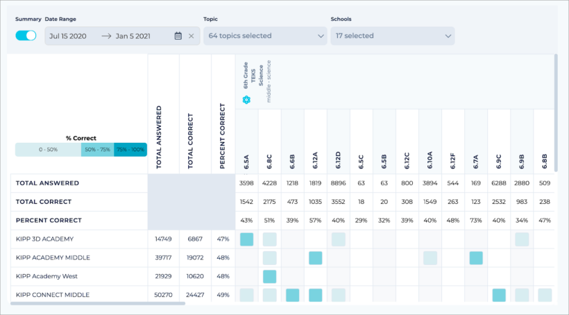 - Administrators can see a descriptive heat map showing performance on questions within standards and topics by district, school, and class!