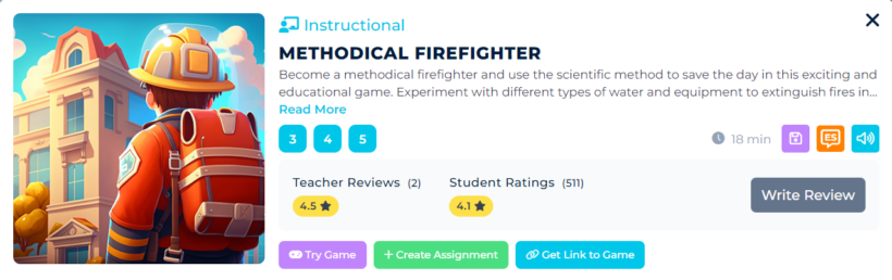 Become a methodical firefighter and use the scientific method to save the day in this exciting and educational game. Experiment with different types of water and equipment to extinguish fires in a virtual environment while learning about the scientific method and problem-solving skills. Progress through different levels and earn points for your success. Have fun learning and honing your methodical firefighter skills!