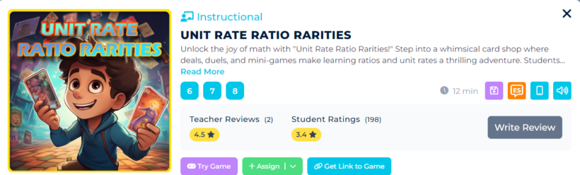 Unlock the joy of math with “Unit Rate Ratio Rarities!” Step into a whimsical card shop where deals, duels, and mini-games make learning ratios and unit rates a thrilling adventure. Students will negotiate card pack prices, face off in exciting battles, and master math skills through lively token-collecting challenges. Designed to be as entertaining as it is educational, this game offers a dynamic, hands-on experience that’s perfect for classroom or at-home learning. Get ready for a vibrant, interactive way to make complex math concepts click!