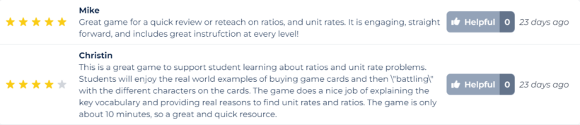 Teacher Reviews: don’t forget you earn Rewards Points for every review you write! So be sure to leave your feedback: you help other teachers pick the right games, you help students to get the best material available, you help us to learn which games we should make more of and you’ll help yourself to some well-deserved rewards! Talk about saving the day!