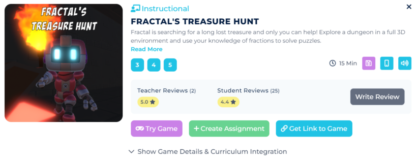 - A love letter to fractions: “Oh fractions, how important you are to our world. Your beauty is how you can stand alone as you represent something more wholesome.” …Let’s stop there, it already got too weird. Thankfully, the skill of understanding fractions as part of a whole is not weird, and your students can engage with it in Fractal’s Treasure Hunt! Find Fractal’s featured further below in this post.